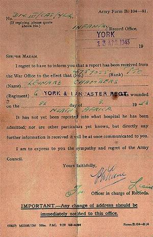 I regret to have to inform you that report has been received from the war Office to the effect that No 4757055 (RANK) …….PTE……(Name) Leonard Chambers……..