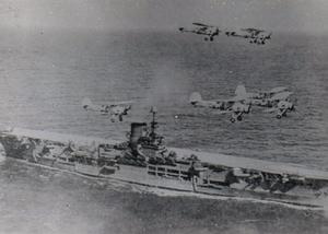 HMS Formidable, an Aircraft Carrier of the Illustrious class surrounded by five Swordfish - Torpedo Spotter Reconnaissance biplanes