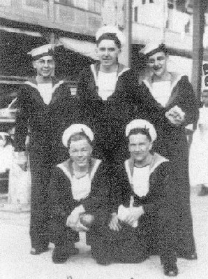 David (back row, left) with his navy friends Jack Petty (middle), Bill Elsy (right)Frank Weston (front left) and Jock "Willie" Williamson (front right) on HMS Queen Elizabeth.
