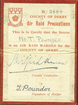 Under the stairs were kept the spare air raid protection (ARP) materials for this end of Cotmanhay. Stirrup pumps which had to be taken out in the yard from time to time and tried out with a bucket of water using a reel of thick ribbed black hose pipe. Spare `Tin Helmets` actually black painted steel with a white W on the front. Thunderflashes and blue grey cylinders of Smoke Bombs. Small tins with tubes of Gas Ointment `to be put into the eyes`. A gigantic map rolled up on two wooden rollers and a box of card board squares each about a 1/4" x 1/4", some yellow, to mark unexploded bombs, and some red to mark exploded bombs. Usually at week-ends Wardens lifted our dustbins to one side and rolled out the map on the slabs near the coal house. The small squares of cardboard were placed here and there and I would hear, "The army bloke says the ones at the bottom of St. James Avenue wouldn`t have gone off anyway." ..."A good many fell in the Cut near the furnaces".... "Th` farmer asked him what to do cos he was wanting to start getting seed in. The Disposal sergeant said it would be alright. It`s gone deep in soft ground so plough over it and when he`s harvested let them know and they`ll come back and deal with it then".