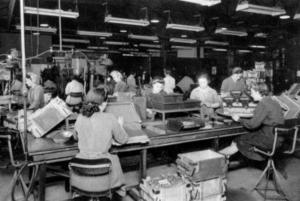 Pat's mother at work in wartime factory. (standing left of centre)