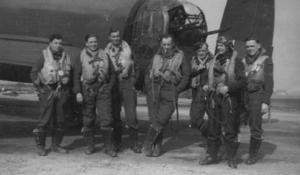 The crew were, from the left: G Forsey (Engineer), L Lund, (bomb aimer), A Moore, (pilot), R Davis, (rear gunner), J Thompson, (mid upper gunner), B Dawson, (wireless operator), and R Price, (navigator).