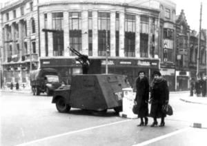 Then my mother found a house for us to live in, in Leicester, where I had a great aunt and uncle. In December ’41 we took over this house, and our furniture arrived from Hastings, and we had Christmas with my sisters. My eldest sister, by this time, had gone into the WAAFs. My great uncle was obviously reasonably well off, because later in ’42 he bought a house in Leicester, and we rented it from him. So we lived there, my Mother and I and one sister, the next eldest was at teacher training college by then. The winter of ’41 was a very cold winter, and at some point or other my father came back from Iceland, and he saw me at the elementary school, thought this was terrible, and arranged for me to go the Wyggeston Grammar School. I felt resentful that he was barging in, disrupting my life, but at least I stayed with the same group of boys for three years, which was a good thing; by then I had moved and moved and moved, and I felt totally disrupted; by the end of the war I had been to thirteen different schools. In early summer of 1942, my mother and my middle sister contracted diphtheria, and they had to go into isolation. My youngest sister and I had to go to the doctor and have swabs taken, we were nine and thirteen. I have no recollection of who looked after us, it may have been my eldest sister with compassionate leave, or my great aunt. She was a most remarkable person, when you think, after that initial evacuation, I’d gone to stay with her, and I felt secure, with a maiden aunt; until she died, I always had tremendous respect for her. We had six weeks off school, then six weeks summer holiday, a long break. Towards the end of the time we went to visit the hospital, but we could only see my mother through the window. I can remember the thousand bomber raid over Germany, because in Leicester these bombers kept going over and over and over. You were always aware of the war, we had a map on the wall, and were watching where the front line was. While we were there I knew that my father was expecting to go across to France in the invasion, and I can remember quite clearly hearing the radio at school saying the Normandy landing has started. It must have been in the staff room, but we could hear this during lunchtime playtime. My father went over on D+1, he was an older soldier, so he was in the Pioneer Corps, but among other things, he was in charge of prisoners of war, in France. I can remember him telling us afterwards that when they arrived at Caen, where there’d been a massive battle, there was so much debris tanks couldn’t get in.