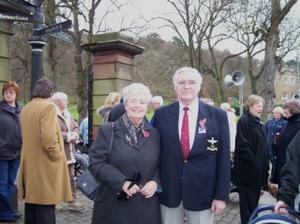 Margaret and Ray Devlin just after attending the Remembrance Sunday Service, the Cenotaph, Whitehaven, Cumbria, 14 November 2004. In June 1943 Ray’s brother George, a POW, gave his life saving a German farmer. Margaret and Ray visited George’s grave in Poland in 1997. [Photograph by Joseph Ritson]