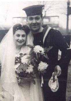 Pop wore his one and only suit — navy blue — and his trilby hat and Mother also wore a dark suit with a blue blouse and a hat on the side of her head at a rakish angle over her new perm. Leslie’s Mother and Father arrived, also dressed in their Sunday best, and Mac, Lindy and Helen wore their uniforms. Leslie and Ernie wore their Naval uniforms, Les sporting the white bow that bridegrooms were permitted.
