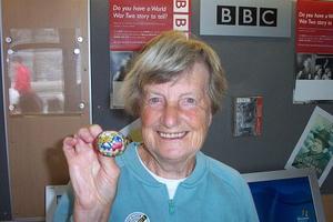 Anne Constain in 2005 holding a shell brooch decorarated by German internees on the Isle of Man in ww2