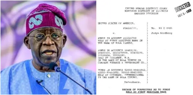 Akwụkọ ahụ nke bu akara afọ 1993 gosiri na ngalaba 'Justice Department' mba Amerịka boro Maazị Tinubu, bụ onye meriri ntuliaka ịbu onyeisala Naịjirịa na 2023, ebubo na ego dị n'ọbaego ya si na mgbere ọgwụike.