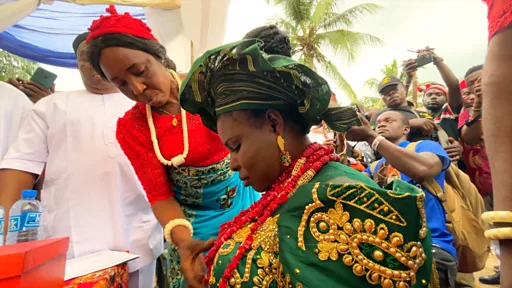 Ọtụtụ ụmụnwaanyị ahụ yi uwe njirimaara ndị ichie na ndị nze wee gbaa egwu ọṅụ mgbe a nabatara ha n'obiọchịchị.