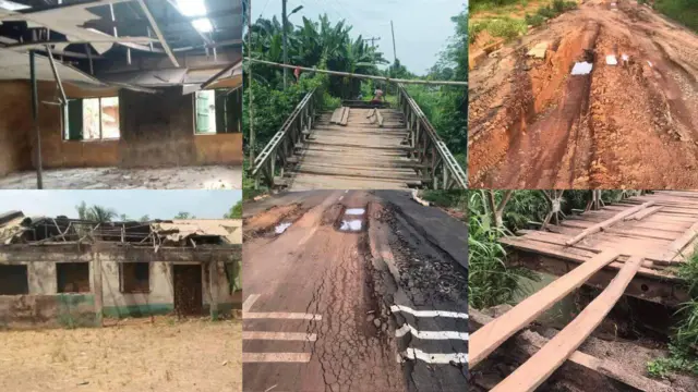 Onye ntaakụkọ BBC setere foto akụrụngwa dị iche iche mebiri emebi n'obodo Ezeukwu, nke gụnyere;