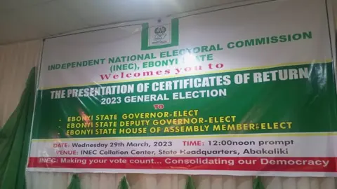 Onyekachi Paulin Ugochi bụ onye na-anọchite Inec n'Ebonyi steeti nyere ha asambodo a ma kọwaa na enyeghị mpaghara ise asambodo mmeri n'ihi ekpebibeghị ntuliaka emere ebe ahụ, ebe mpaghara abụọ ọzọ nwere nsogbu.