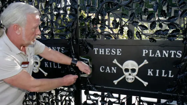 Tanda pada gerbang besi berwana hitam itu menyebutkan, “Tanaman-tanaman ini dapat membunuh”, lengkap dengan hiasan tengkorak dan tulang-belulang sebagai peringatan yang jelas.