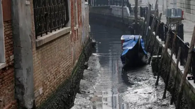 Air yang surut di Kanal Venesia membuat gondola dan taksi air tidak bisa bergerak karena kanal berlumpur dan fondasi bangunan di Kanal Besar jadi tak terlindungi.