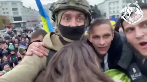 Warga bersorak sorai menyambut pasukan Ukraina di Kherson – satu-satunya ibu kota daerah yang dikuasai oleh Moskow sejak Februari silam – pada Jumat (11/10).