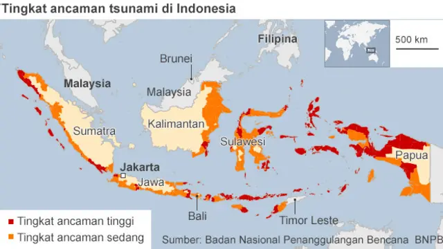 Badan Nasional Penanggulangan Bencana BNPB menyebutkan sekitar lima juta penduduk tinggal di daerah yang rawan tsunami, tetapi upaya relokasi sulit dilakukan.