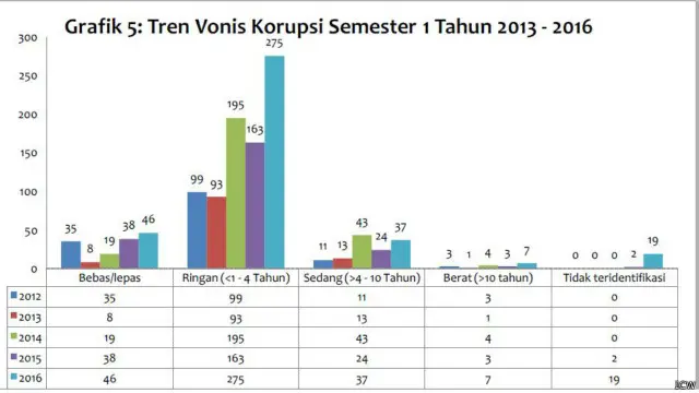 Data vonis korupsi selama Januari hingga Juni 2016 menunjukkan, dari total 384 terdakwa, 275 di antara mereka divonis satu sampai empat tahun penjara. Sedangkan 46 terdakwa divonis bebas.
