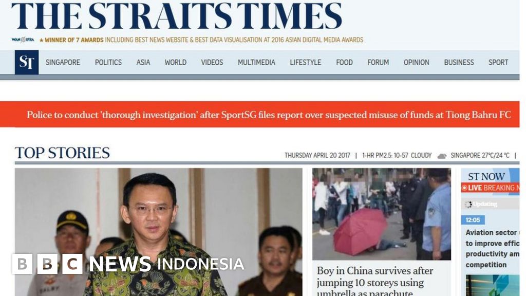 Di kawasan Asia, The Strait Times Singapura menurunkan berita tentang kemungkinan Ahok yang terhindar dari hukuman penjara sebagai berita utama di situsnya, Kamis (20/04).