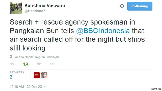 - Laporan langsung tentang pencarian AirAsia QZ8501 pada kedua dapat Anda <link type="page"><caption> klik di sini</caption><url href="http://www.bbc.co.uk/indonesia/dunia/2014/12/141229_trensosial_airasia_livepage_day2" platform="highweb"/></link> dan hari pertama <link type="page"><caption> dapat di klik di sini.</caption><url href="http://www.bbc.co.uk/indonesia/dunia/2014/12/141229_trensosial_airasia_livepage_day2" platform="highweb"/></link>