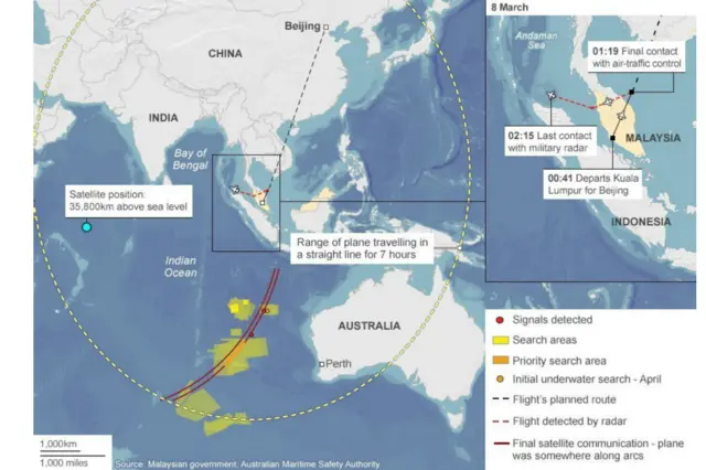 Australia memimpin tim pencarian internasional di Samudera Hindia bagian selatan, sekitar 1,600km dari lepas pantai barat negara itu.