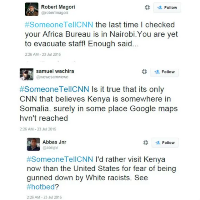 Tagar #SomeoneTellCNN menjadi tren di seluruh dunia manakala warga Kenya mengecam CNN. Adapun stasiun berita itu belum memberikan komentar.