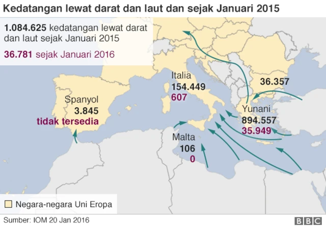 Lebih dari 850.000 orang tiba di pulau-pulau Yunani dari Turki tahun lalu dan sebagian besar berasal dari Suriah, Irak, dan Afghanistan.
