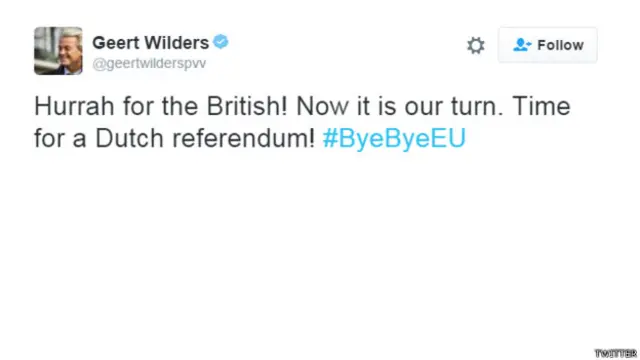 "Kemenangan untuk kebebasan! Seperti yang telah saya minta selama bertahun-tahun, sekarang saatnya kita memiliki referendum yang sama di Prancis dan negara-negara Uni Eropa.”
