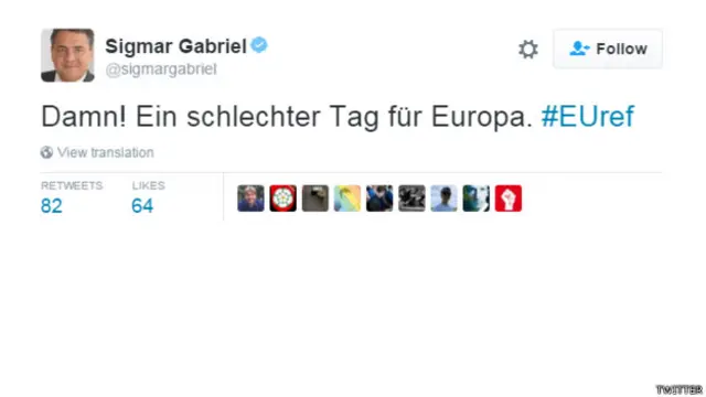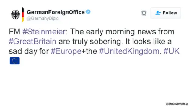 "Berita dari Inggris menyadarkan kita. Tampaknya menjadi hari yang sedih bagi Eropa dan Inggris,” Departemen Luar Negri Jerman mengutip Frank-Walter Steinmeier di twitter.