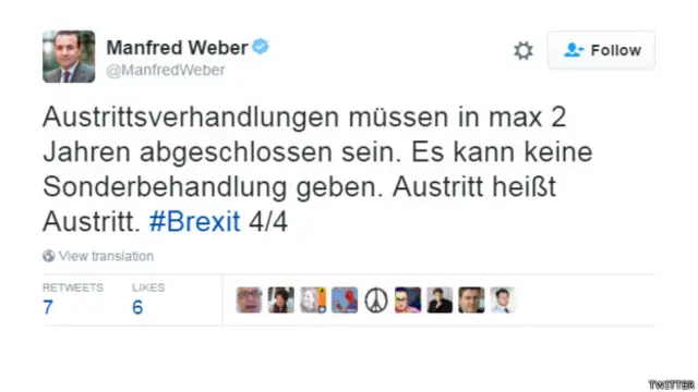 "Negosiasi keluar [dari Uni Eropa] seharusnya dilakukan paling lama dalam dua tahun. Tidak boleh ada perlakuan khusus. Keluar artinya keluar.”