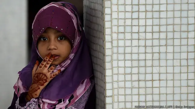 Seorang bocah perempuan, dengan tangan berhiaskan henna, mengikuti salat Ied bersama orang tuanya di ibu kota Malaysia, Kuala Lumpur, pada Rabu (06/07).