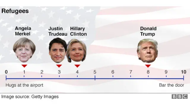 "Hillary Clinton telah meminta peningkatan jumlah pengungsi Suriah untuk menetap di AS, dari yang sekarang berjumlah 10.000 per tahun hingga 65.000, yang selalu diingatkan Trump sebagai kenaikan sebesar 550%," kata Zurcher.