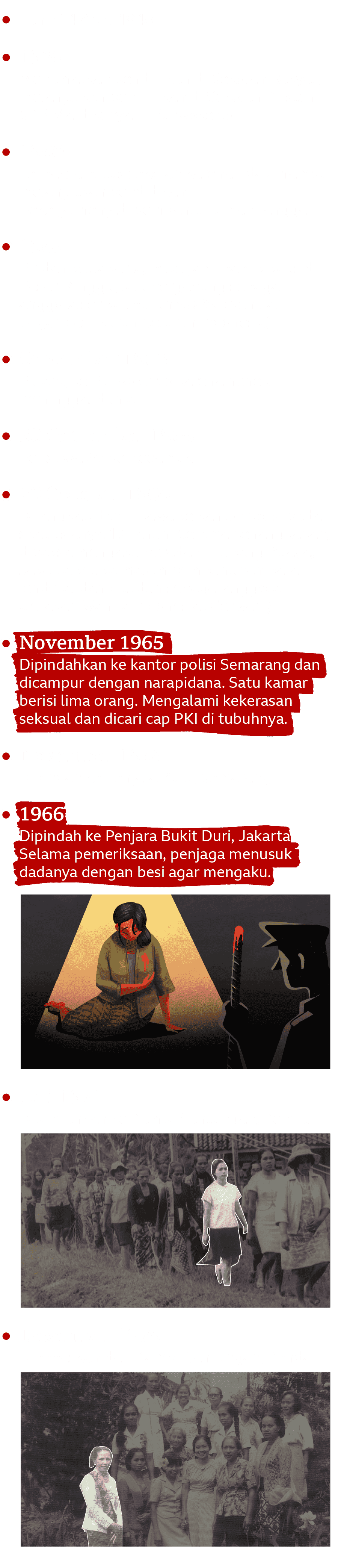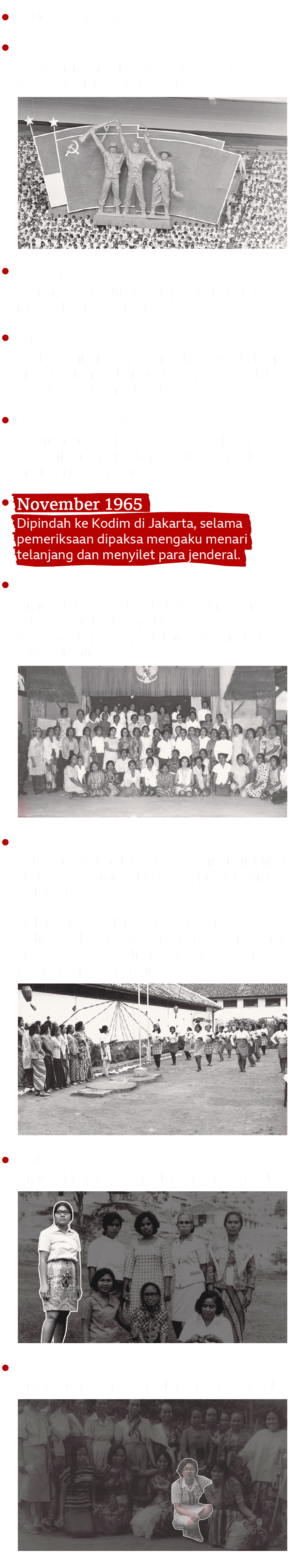 Namun apa yang terjadi sesudahnya adalah belasan ribu orang berhaluan kiri - anggota PKI dan organisasi yang dianggap berafiliasi dengannya, termasuk Gerwani - ditangkap, disiksa, ditahan tanpa proses pengadilan.