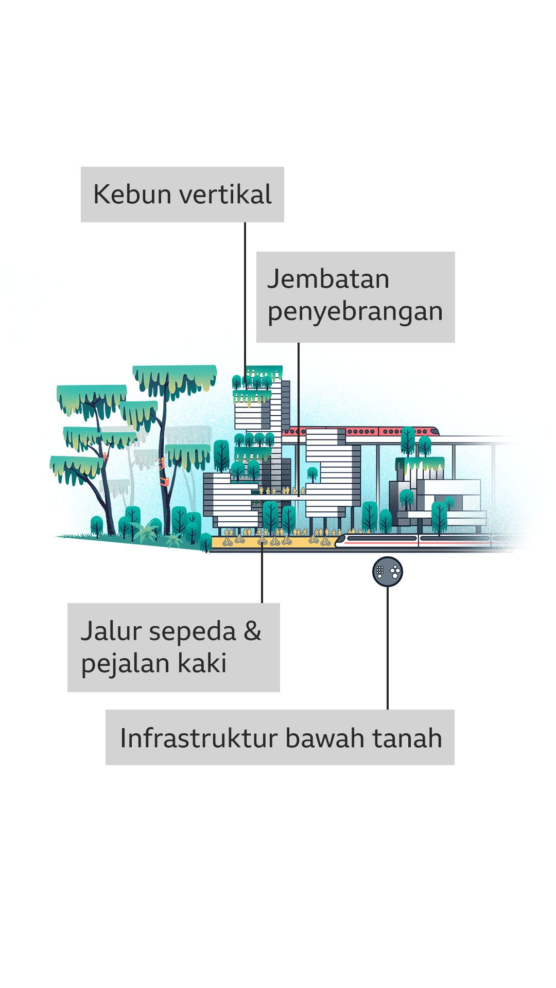 "Di level atas ada penutup. Pepohonan hutan bisa sedemikian tinggi karena bagian puncaknya mereka mencari sumber cahaya. Yang kami lakukan adalah membuat panel surya dan kebun vertikal di setiap bangunan," kata Sibarani.