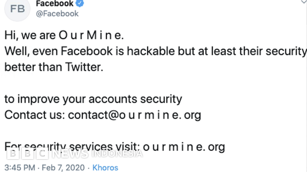 Kelompok ini mengunggah pernyataannya di akun Twitter resmi milik Facebook. "Halo, kami OurMine. Bahkan Facebook dapat diretas, tapi setidaknya keamanan mereka lebih baik ketimbang Twitter."