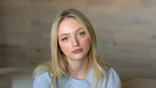 Seorang perempuan muda berambut pirang duduk di tepi tempat tidur sambil memeluk kaki kirinya dengan tangan kirinya sambil berbicara ke telepon. Beberapa helai rambutnya menempel di wajahnya yang basah karena air mata.