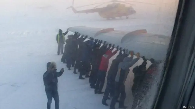 Para penumpang yang akan terbang ke Siberia harus keluar dan mendorong pesawat setelah pedal rem beku karena udara dingin, menurut sejumlah laporan.
