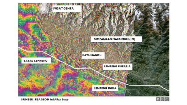 Hasil pertama dari satelit Sentinal 1 Uni Eropa menunjukkan bahwa gempa Sabtu lalu di Nepal tidak meretakkan permukaan, dan mungkin saja ketegangan yang signifikan masih tersimpan di segmen sesar, dan bahwa gempa besar bisa menghantam negara tersebut dalam beberapa dekade mendatang.