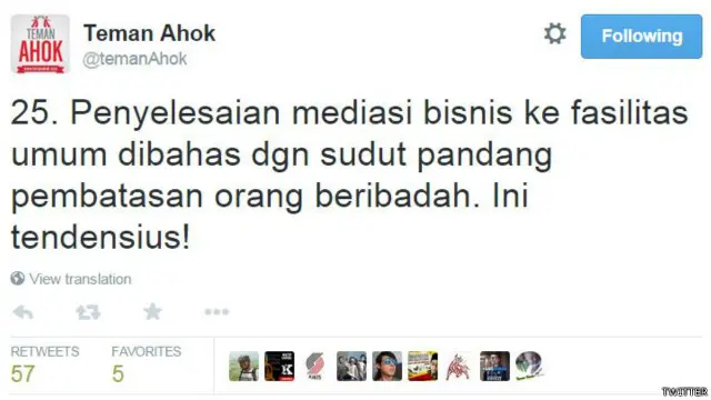 Akun Twitter @TemanAhok, kumpulan relawan untuk Gubernur Basuki Tjahaja Purnama (Ahok), mengatakan kicauan itu "berbahaya" dan bisa memicu konflik SARA.