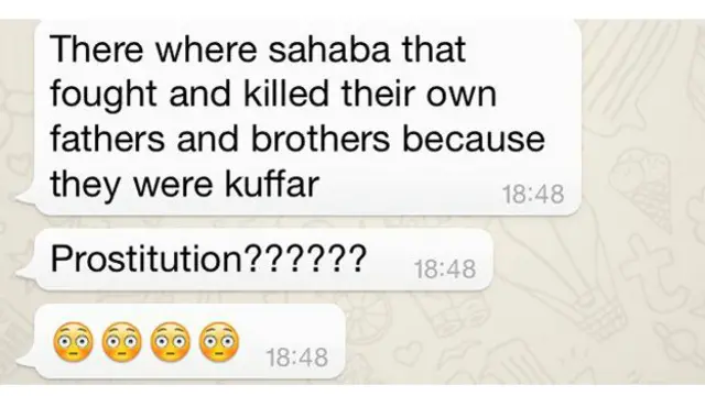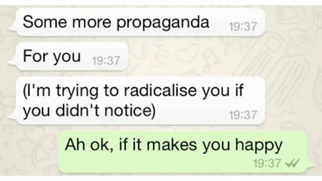 Namun meskipun itu, dia masih mengirimkan tautan ke sejumlah situs jihadi. “Propaganda lagi untukmu. Saya ingin meradikalisasi Anda kalau Anda belum sadar...saya tahu Anda pikir saya seorang teroris.”