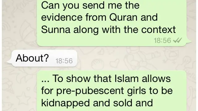 “Islam membolehkan penculikan dan penjualan gadis-gadis muda tak bersalah? Serius? Itu bisa saja adikmu,” saya bertanya.