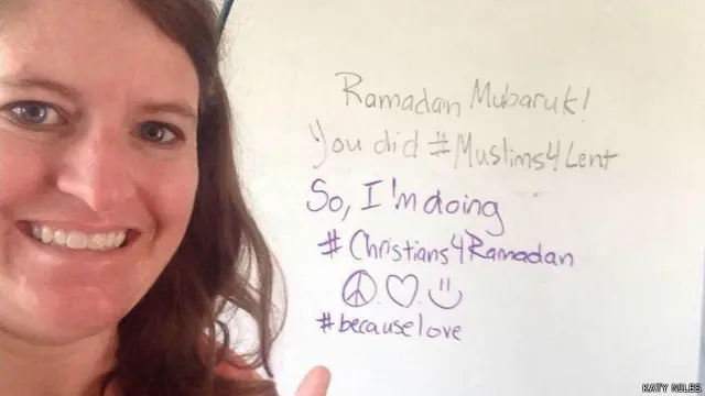 Katy Niles adalah salah satu warga Amerika Serikat yang ikut dalam <link type="page"><caption> gerakan #Christians4Ramadan</caption><url href="http://www.bbc.com/indonesia/majalah/2015/07/150706_trensosial_christians4ramadan" platform="highweb"/></link>, sebuah bentuk solidaritas umat Kristiani pada umat Muslim dengan ikut berpuasa selama Ramadan.