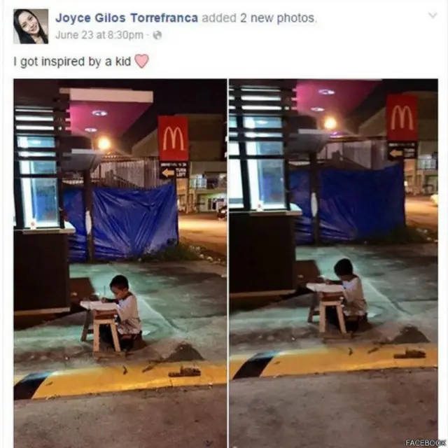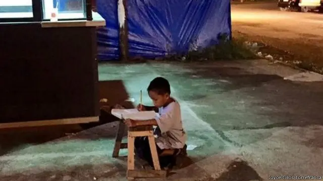 Mahasiswa kedokteran, Joyce Torrefranca, mengambil gambar itu di Kota Cebu, Filipina, dan mengunggahnya di Facebook dengan tulisan “Saya terinspirasi oleh anak ini.”