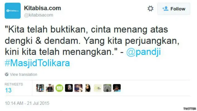 Sebuah gerakan yang diinisiasi Pandji Pragiwaksono berhasil mengumpulkan sumbangan lebih dari Rp270 juta untuk membangun kembali musala di Tolikara pascainsiden yang terjadi akhir pekan lalu.