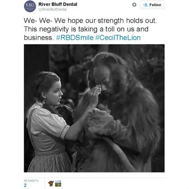 Sebuah akun Twitter parodi dibuat menggunakan nama klinik Palmer – River Bluff Dental – untuk mengejek dokter gigi itu, dan sempat mempedaya banyak orang di dunia maya.