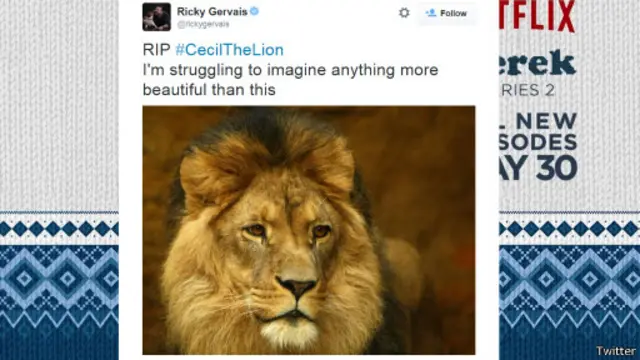 Tagar #CecilTheLion telah muncul hampir 250.000 kali dalam 24 jam terakhir di Twitter. Sebuah kicauan oleh pelawak Ricky Gervais telah di re-tweet dan difavoritkan lebih dari 40.000 kali.