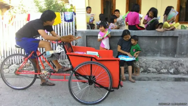 "Saya buat becak karena saya berpikir: masa saya jangkau pulau-pulau kecil tapi lingkungan saya sendiri tidak dikasih bacaan."
