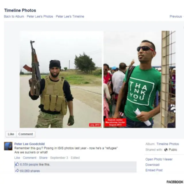 "Ingat pria ini? Berpose sebagai anggota ISIS tahun lalu -- sekarang, dia adalah 'pengungsi'," tulis pemilik akun Facebook Peter Lee Goodchild.