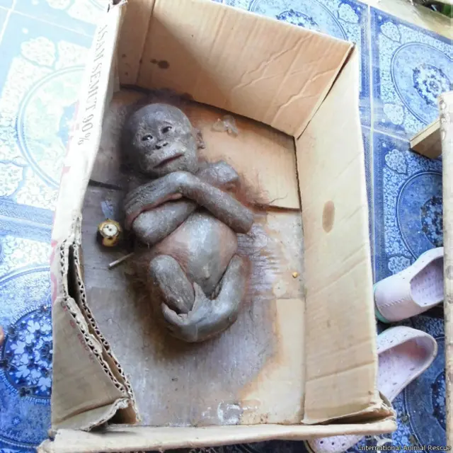 Seekor bayi orang utan ditemukan dalam keadaan kritis, nyaris seperti mayat, di dalam kardus di Simpang Hulu, Kalimantan Barat.