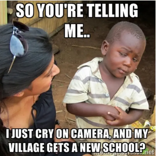 Gambar anak Afrika dengan mimik muka masam ini pertama kali diunggah di Reddit tiga tahun lalu oleh seseorang di Texas. Dia mengambil foto itu dari laman Facebook temannya. Sejak itu, gambar ini telah dijadikan meme berkali-kali sebagai bahan bercanda yang kadang nyiyir dan satir.