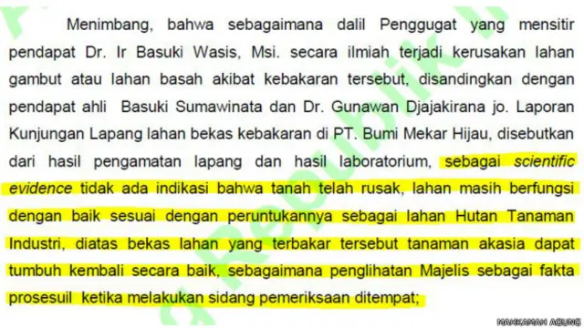 "Itu kemudian dikutip hakim dalam pernyataannya, bahwa lahan yang terbakar tidak mengalami kerusakan, masih subur dan bisa ditanami dengan pohon akasia."