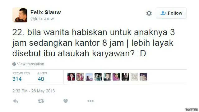 Kicauan Felix itu adalah satu dari <link type="page"><caption> serangkaian tweet</caption><url href="https://twitter.com/search?q=from%3Afelixsiauw%20since%3A2013-05-28%20until%3A2013-05-29&src=typd&lang=en" platform="highweb"/></link> yang isinya menganggap bahwa seorang perempuan bisa dikatakan sebagai ibu jika dia mendedikasikan lebih banyak waktu untuk anaknya. "Kita adalah apa yang kita lakukan paling banyak dalam keseharian kita," ujarnya dalam kicauan yang lain.