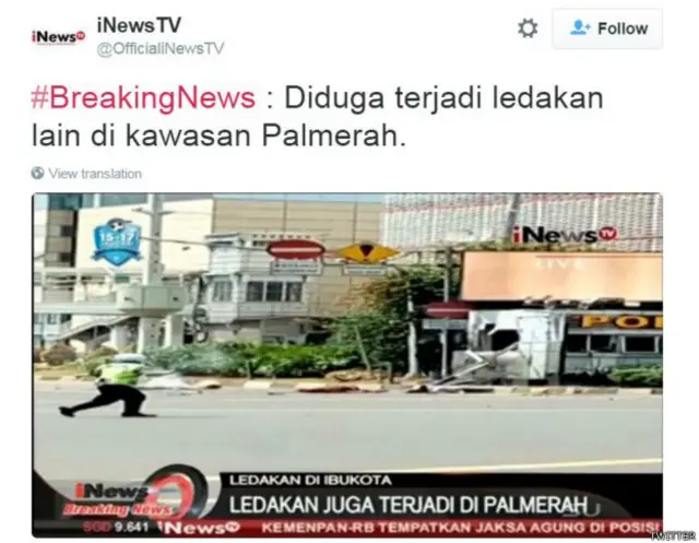 INews TV juga memberitakan pernyataan yang keliru dengan menulis judul <link type="page"><caption> “Ledakan Juga Terjadi di Palmerah”</caption><url href="https://twitter.com/OfficialiNewsTV/status/687488655913426944" platform="highweb"/></link> dalam tayangannya.